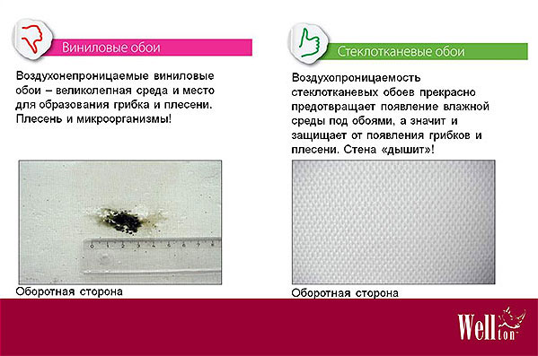 Теперь, когда мы знаем, что такое грибок и плесень на стенах и из-за чего они появляются, самое время подумать, что поможет избежать появления этих неприятных представителей «царства грибков». Конечно можно понизить температуру в квартире ниже 10°С, но тогда вместе с грибком сбегут и все жильцы. Открыть доступ солнечному свету к стенам – тоже нереально. Не будешь же жить в «голой» бетонной коробке, да и не все окна в квартире выходят на солнечную сторону. А вот обеспечить нормальный воздухо- и влагообмен между стеной и помещением – можно! Чтобы под обоями у Вас не возникало влажного «болота» нужно всего лишь перестать клеить бумажные и виниловые обои, а начать использовать во внутренней отделке помещений стеклообои! Благодаря тканой структуре полотен стеклообоев Wellton, они обеспечивают натуральный воздухо- и влагообмен. Как говорят профессионалы: стена со стеклообоями – «дышит». Под стеклообоями Wellton никогда не скапливается влага, а значит, никогда не заведётся плесень и грибок!