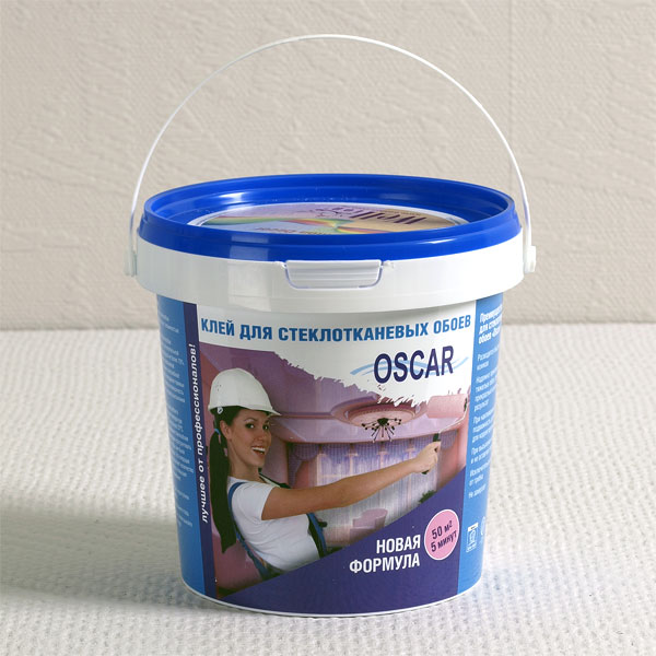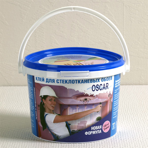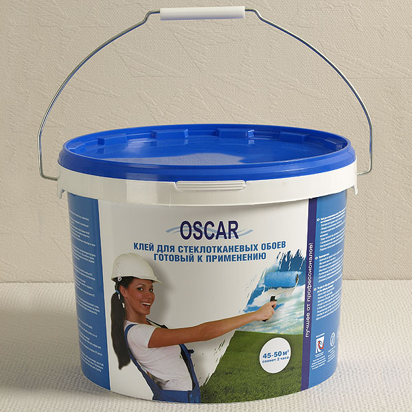 Для наклеивания надо использовать специальный клей для стеклотканевых обоев. На практике, лучшие показатели показывает клея торговых марок Oscar и Wellton. Этот клей гарантирует надёжность и высокое качество приклеивания стеклотканевых обоев. В зависимости от желания и ситуации, можно выбрать уже готовый к применению клей Wellton или Oscar как в сухом, так и в готовом виде. Клей Oscar в сухом виде выпускается в трёх вариантах фасовки: картонная пачка 200 г (на 25 кв.м.) и пластиковые герметичные вёдра 400 г (на 50 кв.м.) и 800 г (на 100 кв.м.). Готовый клей Oscar предлагается в трёх вариантах фасовки – пластиковые герметичные вёдра по 2.5 , 5 и 10 кг, для приклеивания 12, 25 и 50 кв.м. стеклотканевых обоев соответственно. Готовый клей Wellton предлагается в двух вариантах фасовки – пластиковые герметичные вёдра по 2.5 и 10 кг, для приклеивания 12 и 50 кв.м. стеклотканевых обоев соответственно.