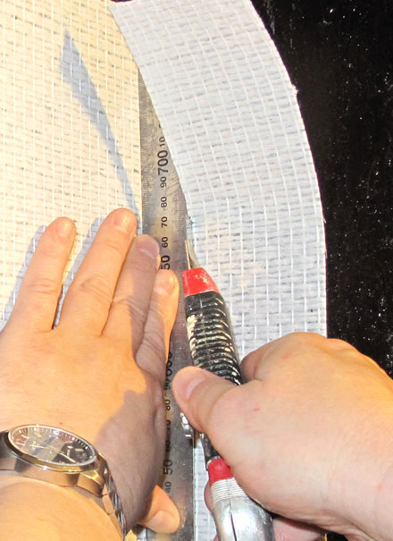 Также, жаккардовые стеклотканевые обои можно наклеивать без предварительной нарезки всего рулона на полотна. В этом случае просто отмотайте необходимое количество полотна от рулона, который будет находиться на полу, приложите полотно к стене, совместите тканый рисунок и отрежьте полотно от рулона в районе плинтуса с небольшим припуском.