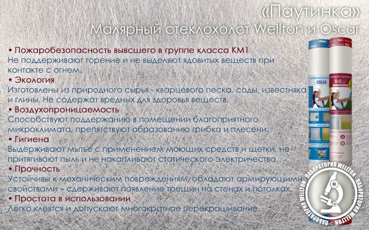 Малярные стеклохолсты Wellton и Oscar – это невероятно надёжные и качественные материалы для финишной отделки стен и потолков и защиты поверхности от микротрещин. Наклеенные на потолок или стены малярные стеклохолсты не позволят штукатурке или шпатлёвке растрескаться и разрушиться, даже при довольно сильных нагрузках, ведь они выдерживают нагрузки на разрыв до нескольких тонн на квадратный метр полотна! Вот такую экстремально прочную, экологически чистую и противопожарную «паутинку» под торговыми марками Wellton и Oscar выпускает наша компания уже почти 20 лет, делая ваш ремонт более простым, быстрым и качественным.
