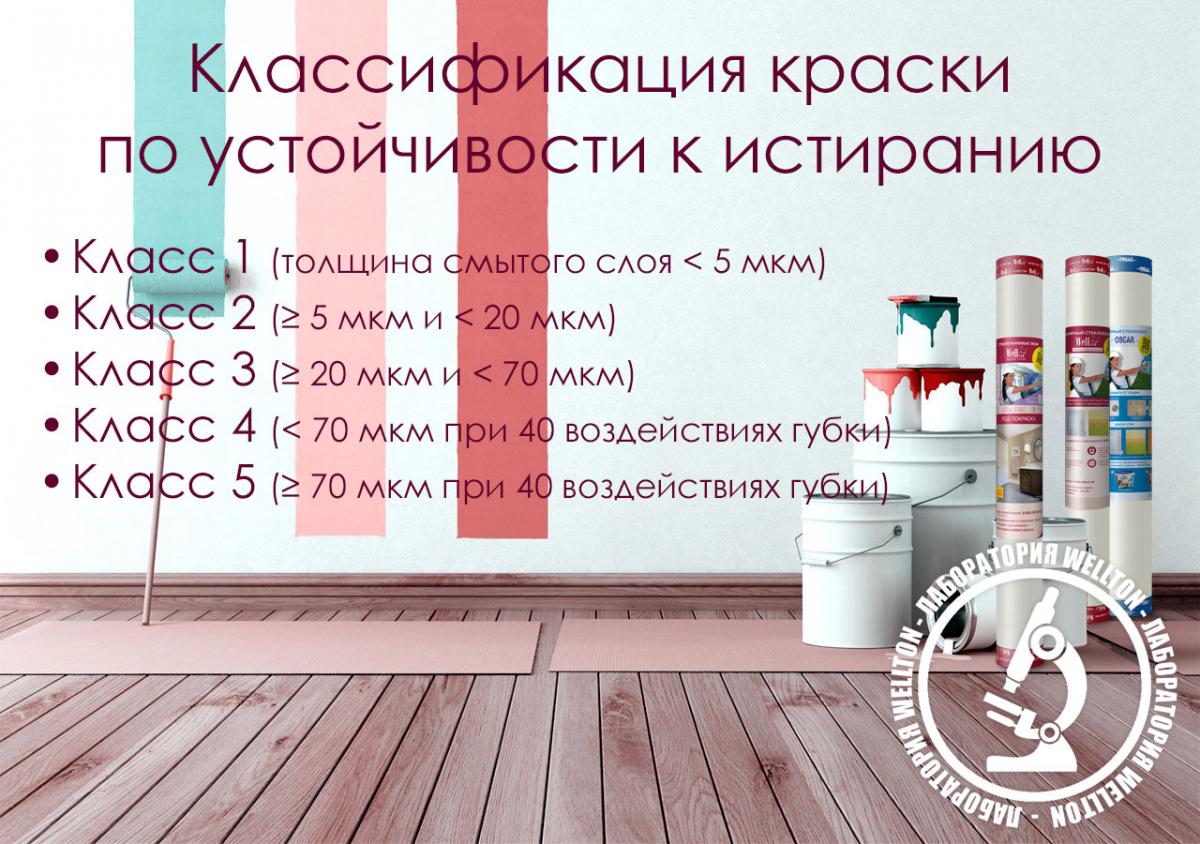 Ещё один важный параметр, вытекающий из предыдущего – это степень устойчивости к влажному истиранию. По признанной во всём мире классификации насчитывается 5 классов такой устойчивости. И чем выше класс, тем устойчивей краска к воздействию губкой, тряпкой или щёткой. Так, например, самый неустойчивый 5-й класс – это, по сути «побелка», внушительный слой которой можно стереть буквально одним движением влажной тряпки. С другой стороны, краски 2-го и особенно 1-го класса обладают отличными показателями устойчивости к влажному истиранию, что крайне важно в обычной жизни в квартире или собственном доме.