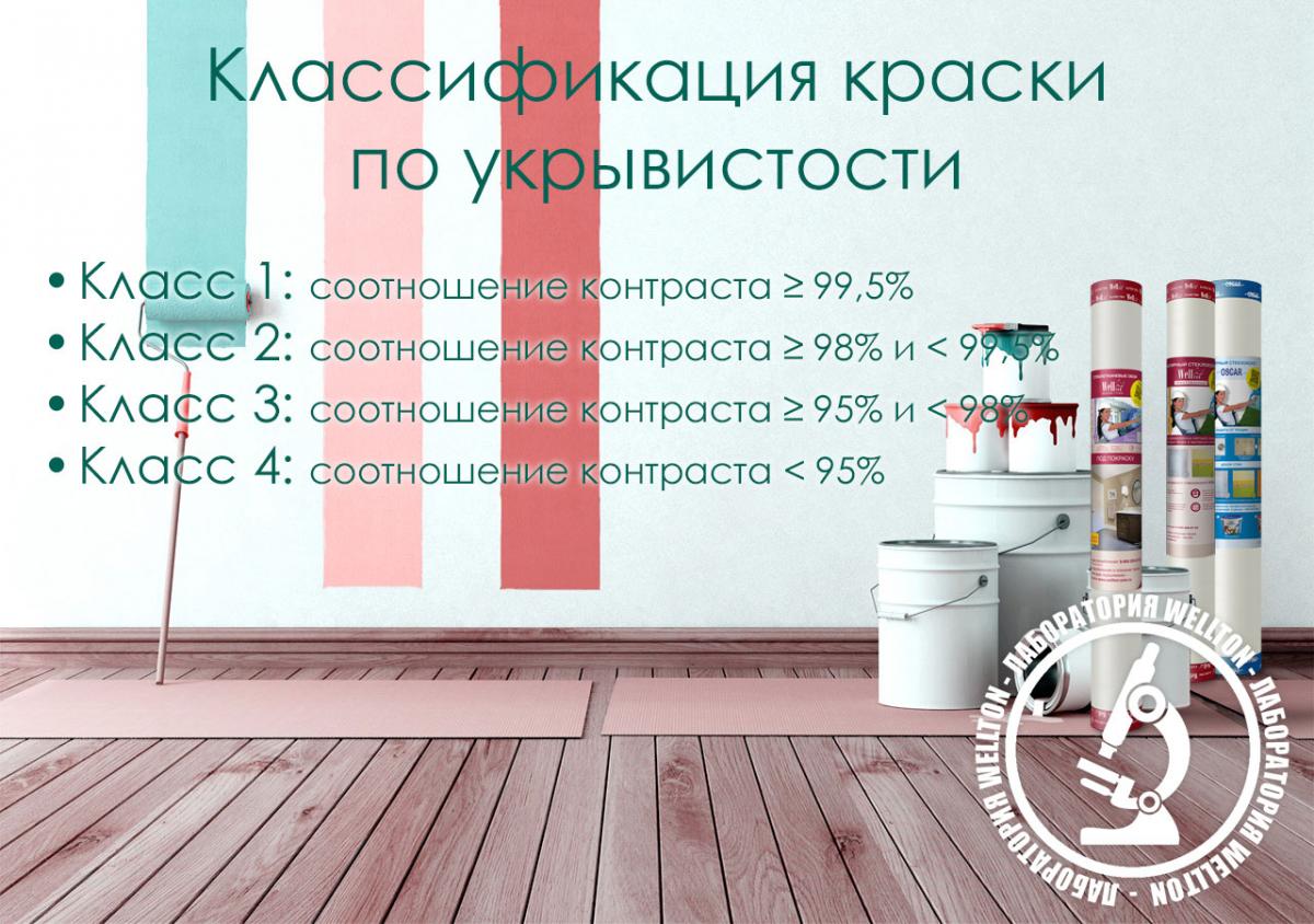 Наверное, не будет большим преувеличением сказать, что следующий параметр краски входит в тройку самых важных, наряду со степенью глянца и устойчивостью к влажному истиранию. Это укрывистость краски. Укрывистость краски – её способность перекрывать цвет основания. Согласитесь, неприятно, если из-под слоя краски будут просматриваться «зелень» гипсокартона, серые пятна шпатлёвки или линии разметки под электрическую проводку и розетки, сделанные на стене карандашом. По международной классификации укрывистость краски подразделяется на 4 класса, из которых первый класс является самым лучшим, поскольку краски, обладающие первым классом укрывистости, практически за один слой могут перекрыть даже довольно контрастное основание. Иными словами, сделать из белой комнаты чёрную и наоборот, можно буквально за один проход малярного валика.