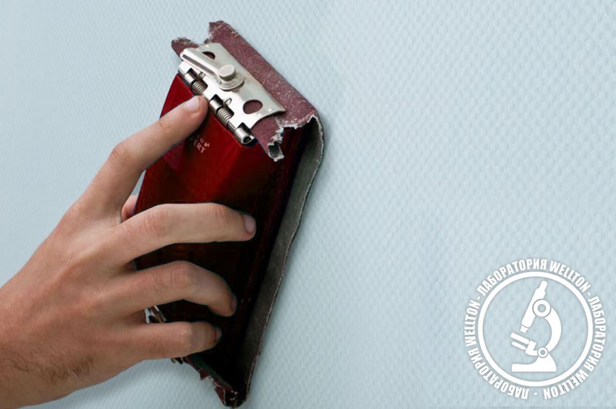 Кроме этого важно помнить, что стеклообои – это тканый материал, сотканный из нитей. Густая краска, чрезмерное давление на малярный валик и излишнее количество прокатываний валиком по одному месту могут спровоцировать вытяжение волокон из полотен стеклообоев. Эти тончайшие волокна могут быть едва заметны глазу, но при окрашивании они становятся похожими на неприятные приподнятые чешуйки. В итоге на стене вы увидите неприглядные сероватые пятна, которые возникают из-за микроскопических теней, падающих от этих приподнятых волокон. Помните, что качественно окрашенные стеклообои должны быть абсолютно гладкими на ощупь! Ваша рука не должна ощущать никаких «царапающих» воздействий! Если таковые имеются, значит, при окрашивании были допущены ошибки и их, перед финишным окрашиванием, следует устранить. Сделать это можно довольно легко при помощи обычной мелкозернистой наждачной бумаги. Достаточно слегка ошкурить поверхность высохших стеклообоев, чтобы устранить приподнятый ворс. После чего нужно протереть стеклообои влажной тряпкой для удаления пыли от ошкуривания, и затем покрыть стеклообои финишным слоем краски.