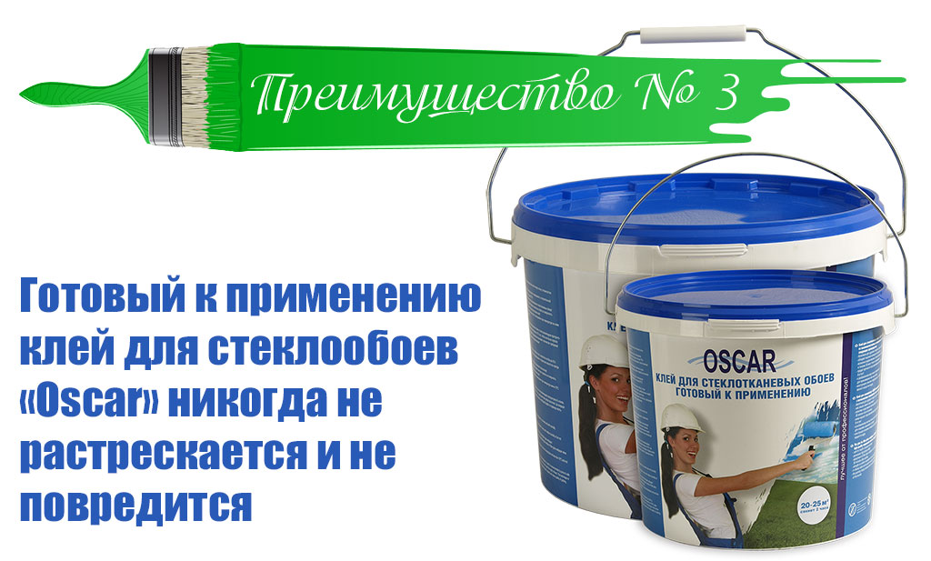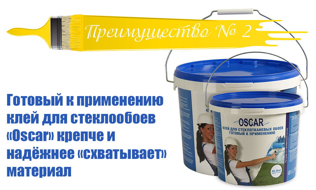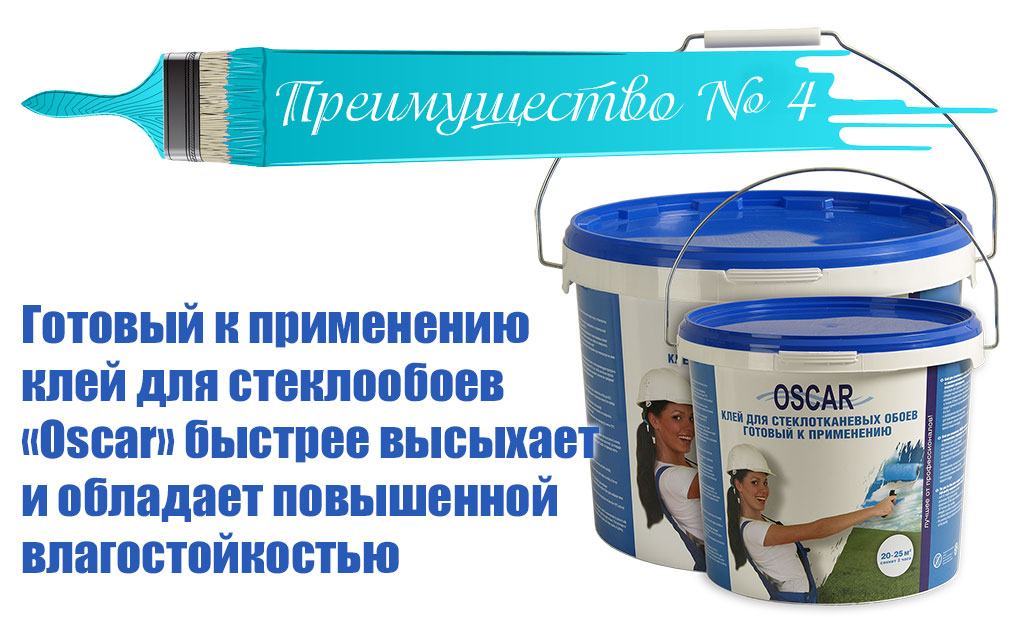 - готовый клей Oscar обладает повышенной влагостойкостью и надёжно удерживает покрытие, даже при повторном увлажнении: окрашивание, шпатлевание малярного стеклохолста и т.п.