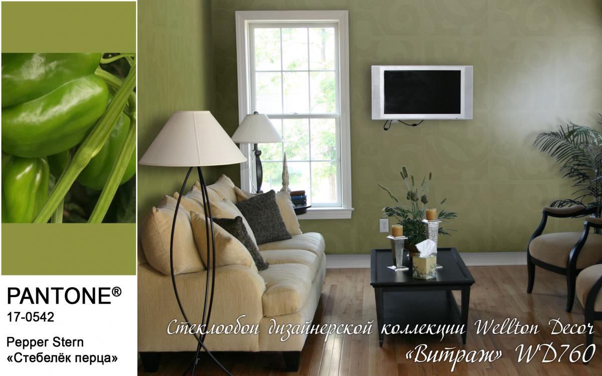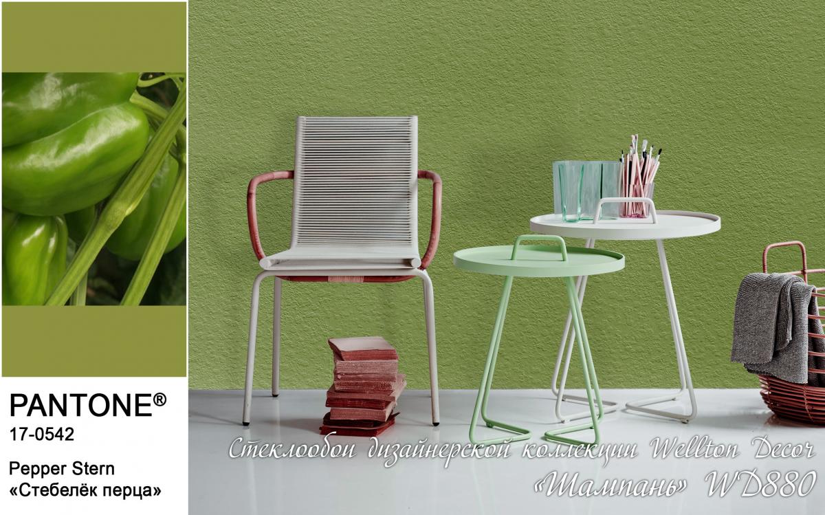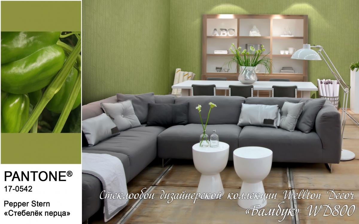 В первую очередь, цвет «Стебелёк перца» (Pepper Stem) прекрасно будет смотреться на стенах. Выкрашенные в этот натуральный оттенок салатового цвета стены станут прекрасным фоном для уютного и комфортного интерьера. А в сочетании с фактурными полотнами стеклообоев Wellton и Oscar станет настоящей находкой для людей, стремящихся к натуральности и ЭКО стилю в интерьере. Также оттенок «Стебелёк перца» станет прекрасным решением для всех текстильных элементов интерьера: от штор и до обивки мягкой мебели.